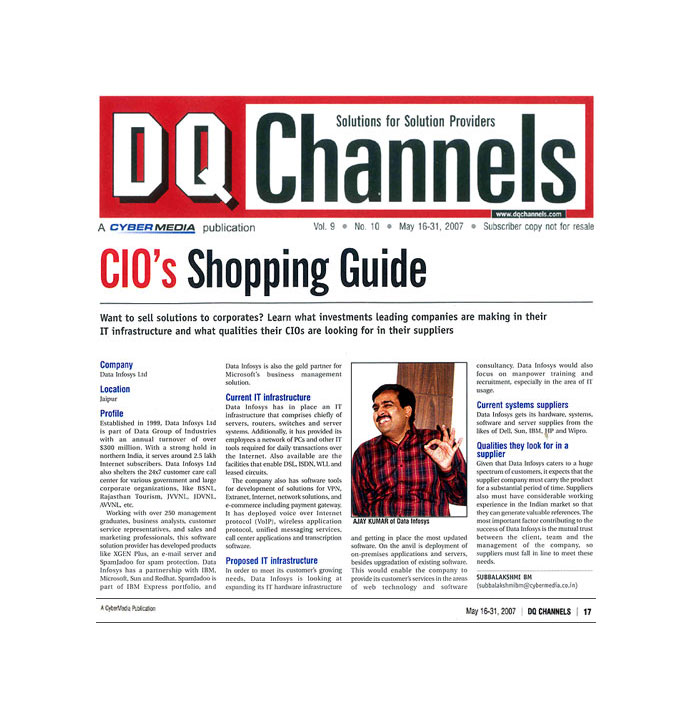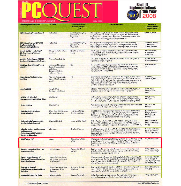 Project Ranthambor Wildlife Safari Rajasthan Handled by Data Ingenious Global Limited (Formerly Known as Data Infosys) – Best IT Implementations Of the Year 2007- June, PC QUEST