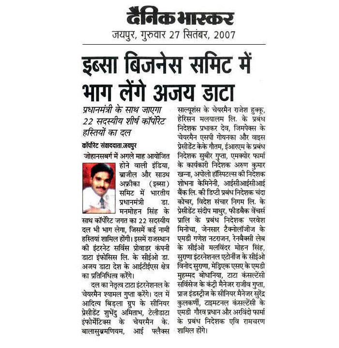 IBSA Business Summit will be attended by Mr. Ajay Data- 27 November, Danik Bhaskar