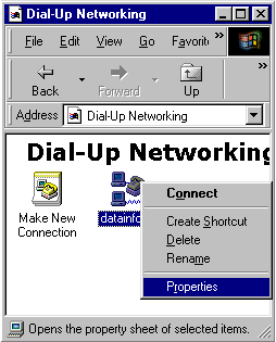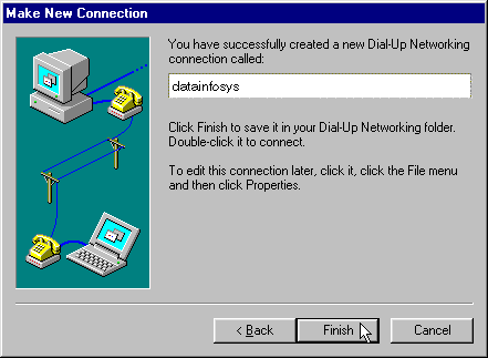 Once all the settings are complete, the task of dialing into datainfosys can be automated by creating an datainfosys icon on your Desktop. We recommend using the shortcut instead of allowing your browsing software to dial for you, as you will tend to make a more reliable connection.