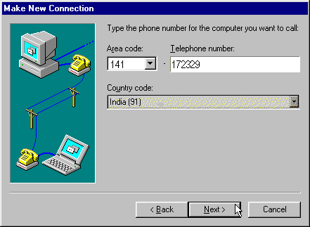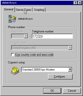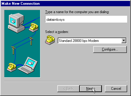 Type datainfosys for the Name of the Computer you are dialingThe modem set up on your computer should already be displayed. If it is not, then please consult your Windows ’95 documentation for further information on how to set up a modem for use under Windows ’95